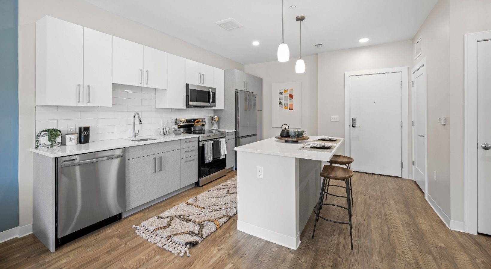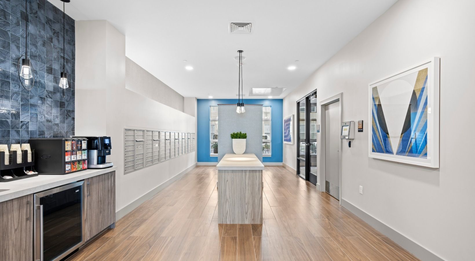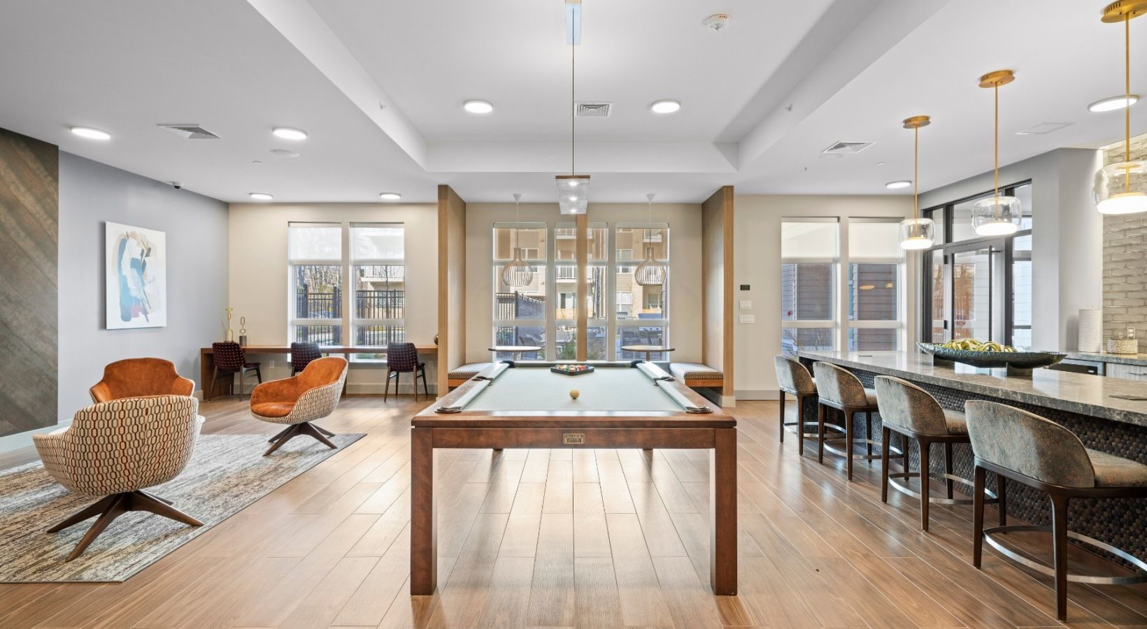 Amenities include an outdoor pool, several courtyards, a playground, along with a large indoor amenity space with spaces to work, play games, a community kitchen and fitness center. Have a pet? Give them a bath in the community Pet Wash!